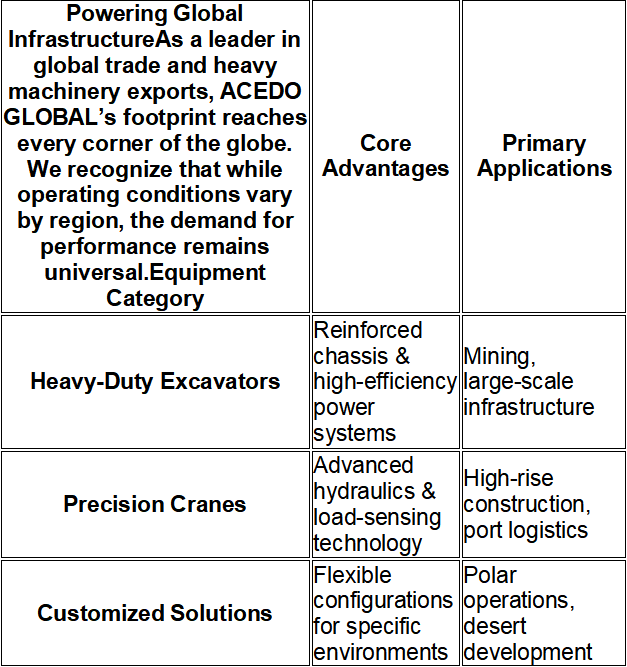 Nuestra ingeniería: Cada máquina ACEDO GLOBAL, desde nuestras excavadoras de servicio pesado hasta nuestras grúas de precisión, está diseñada para ofrecer el máximo rendimiento en los entornos más exigentes.